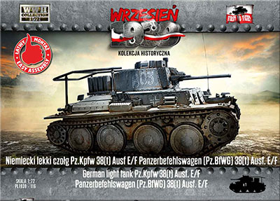 Panzerkampfwagen 38(t)は第二次世界大戦前に、チェコのチェコダ社が開発・製造した、軽戦車である。I号戦車とII号戦車が大半を占める、第二次世界大戦初期のドイツ軍において、信頼性の高い優秀な車輛であり、強力な長砲身の37 mm戦車砲を装備する本車は、未だ数の揃わないIII号戦車の代役として、主力車両の一角と言っても過言ではない存在感を示した。E / F型は車体・砲塔前面の装甲が50mm、側面30mmに強化された。これに伴い、段付きだった戦闘室前面装甲も直線的な一枚板へとデザインの変更が成されている。前面装甲の強化によりノーズヘビーとなったため、前部サスペンションのリーフスプリングの枚数を15枚に増やして対応している。E/F型は殆ど同じ仕様だが、後者には標準で車体後部に発煙筒入り装甲ボックスが追加され、マフラーの位置が上がっている。E型は1940年11月 - 1941年5月に275輌、F型は1941年5月 - 10月に250輌が生産された。